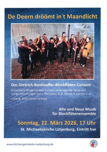 Die 13 Spielenden des Dietrich-Bonhoeffer-Blockflöten-Consorts präsentieren ihr Jahreskonzert mit klingenden Geschichten, schwungvollen Tänzen und ruhigen Stimmungen. Unter der Leitung von Antje Susanne Kopp wird Alte und Neue Musik für Blockflötenensemble erklingen, darunter Kompositionen von Johann Pachelbel, Raphael Benjamin Meyer und Pieter Campo.